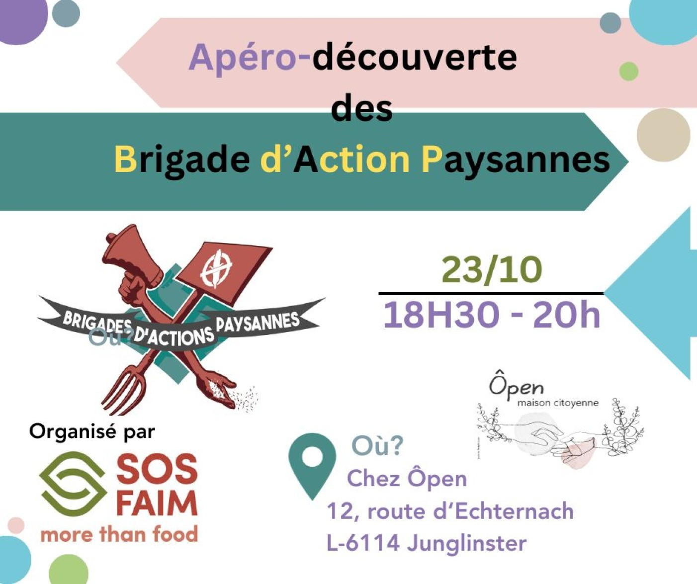 SOS-Faim Luxembourg vous invite chez Ôpen pour un apéro-découvert des Brigades d'Action Paysannes (ou BAP).