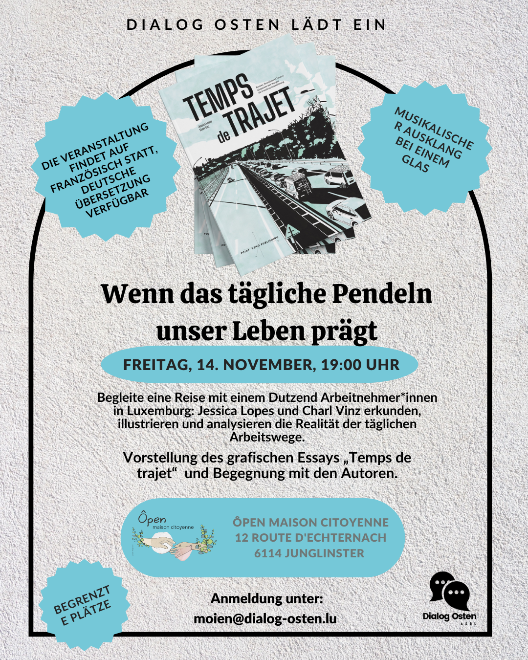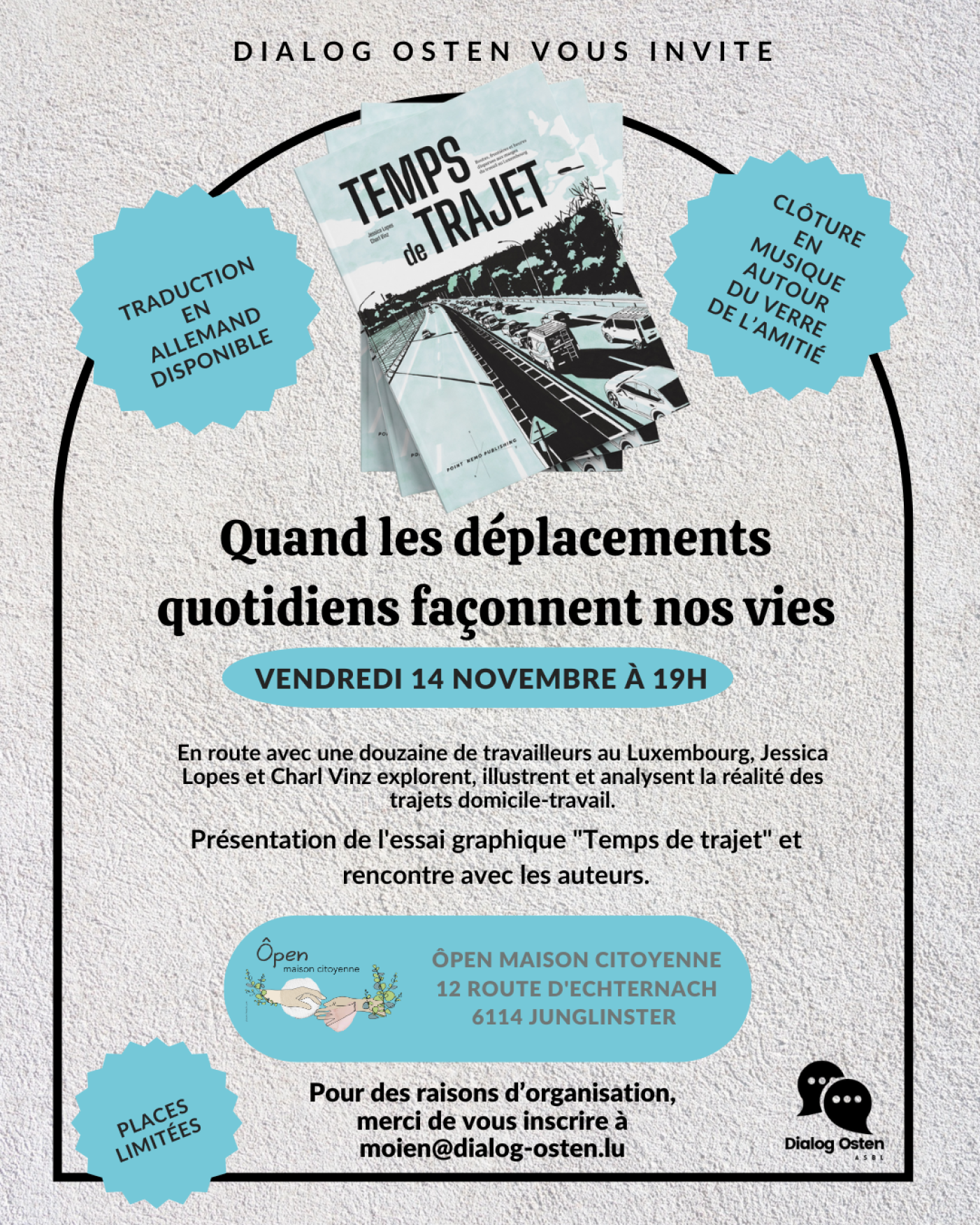 Les auteurs Jessica Lopes et Charl Vinz présenteront leur livre " Le temps de trajet" ; un livre illustré qui mène une réflexion sociologique à travers des portraits de personnes qui parlent de leur temps de trajet pour le travail. Moment d'échange et de réflexion autour d'un apéro sur les temps qui composent notre vie, les enjeux de mobilité, de proximité ou d'éloignement entre lieu de vie et de travail. Inscription souhaitée.