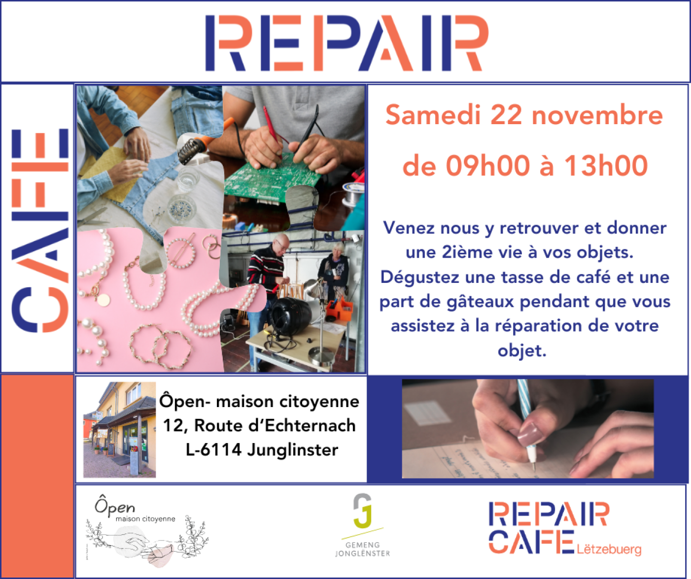 🛠️ Amenez vos objets entre 09h00 et 12h00, et nos bénévoles passionnés feront de leur mieux pour leur redonner vie. Vous pouvez assister à la réparation, poser des questions et apprendre à le faire vous-même !