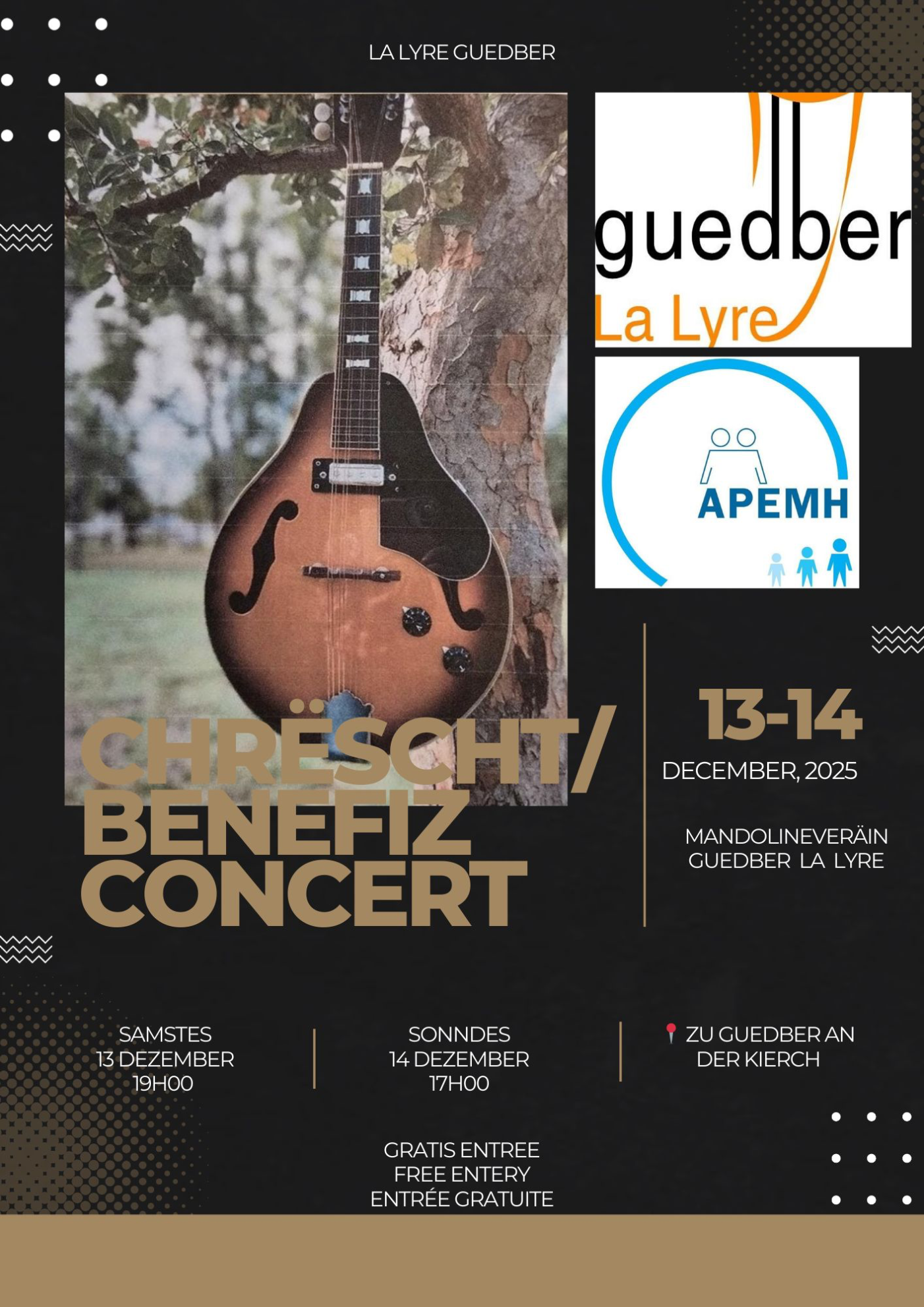 Comme chaque année, l'orchestre mandoliniste "La Lyre" de Godbrange vous invite à ses concerts traditionnels de bienfaisance pour Noël à l'église de Godbrange. Venez nombreux écouter le samedi, 13 décembre 2025 à 19 heures et dimanche, le 14 décembre 2025 à 17 heures le son chaleureux des mandolines.