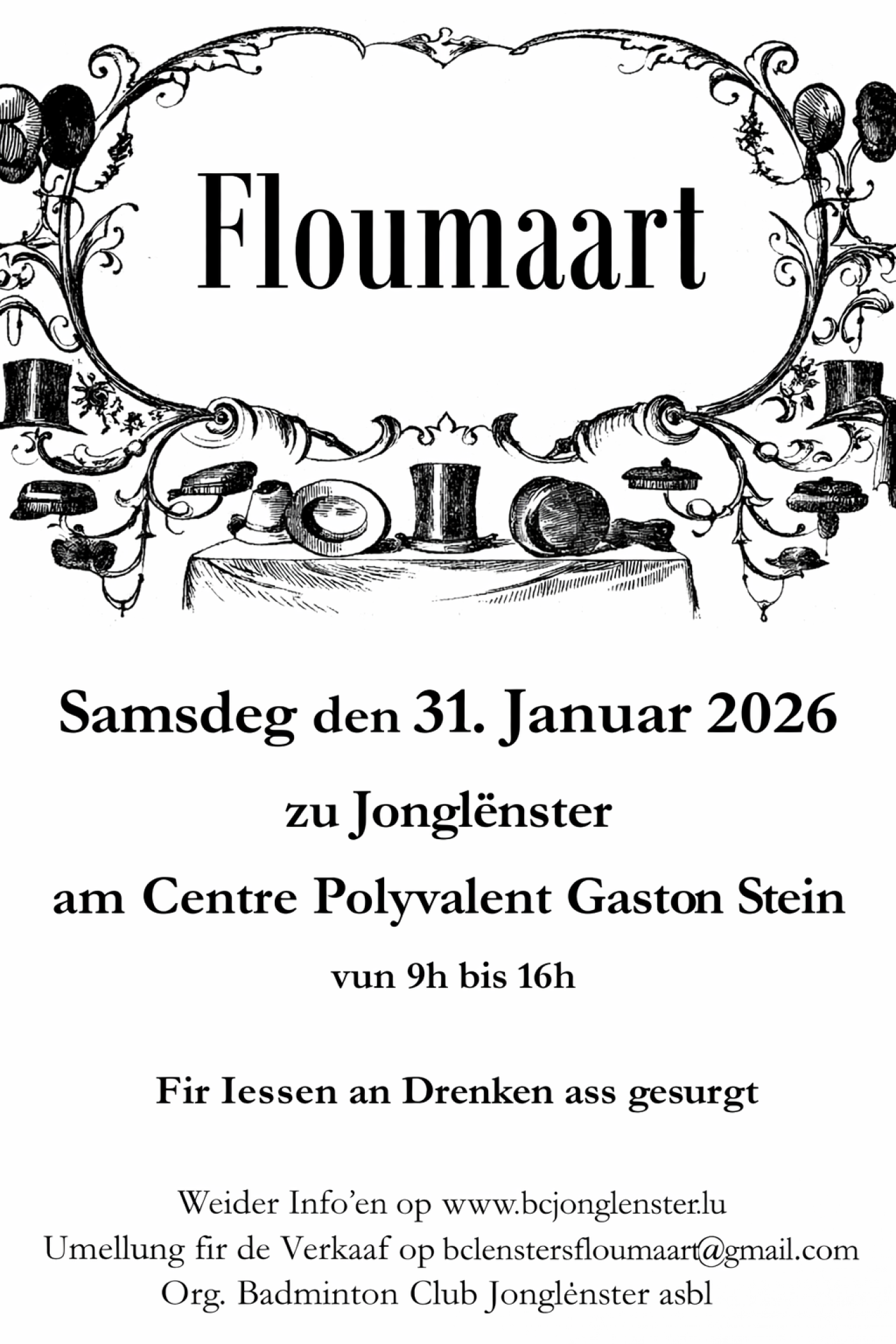 Le Badminton Jonglënster organise le samedi 31 janvier 2026 son marché aux puces à Jonglinster au Centre Polyvalent Gaston Stein, 1, rue Emile Nilles, de 9h00 à 16h00.
