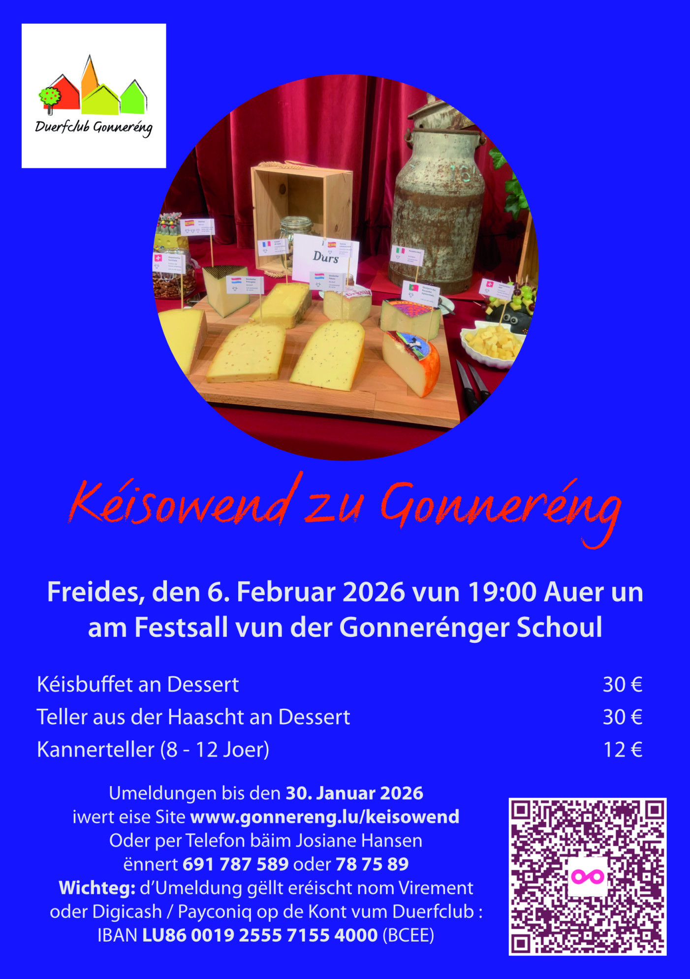 Cheese Evening in Gonderange on friday, 6th February 2026 starting at 19:00 hour at the ballroom of the Gonderange school
