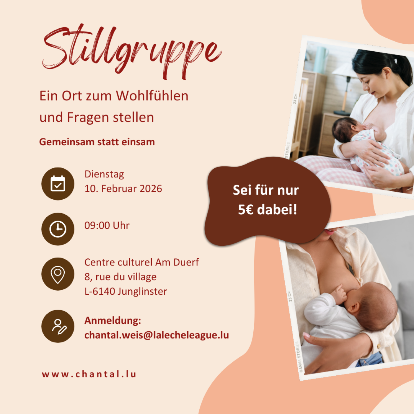 Kosten: Für Mitglieder der La Leche League Luxemburg gratis, Nicht-Mitglieder 5 €
