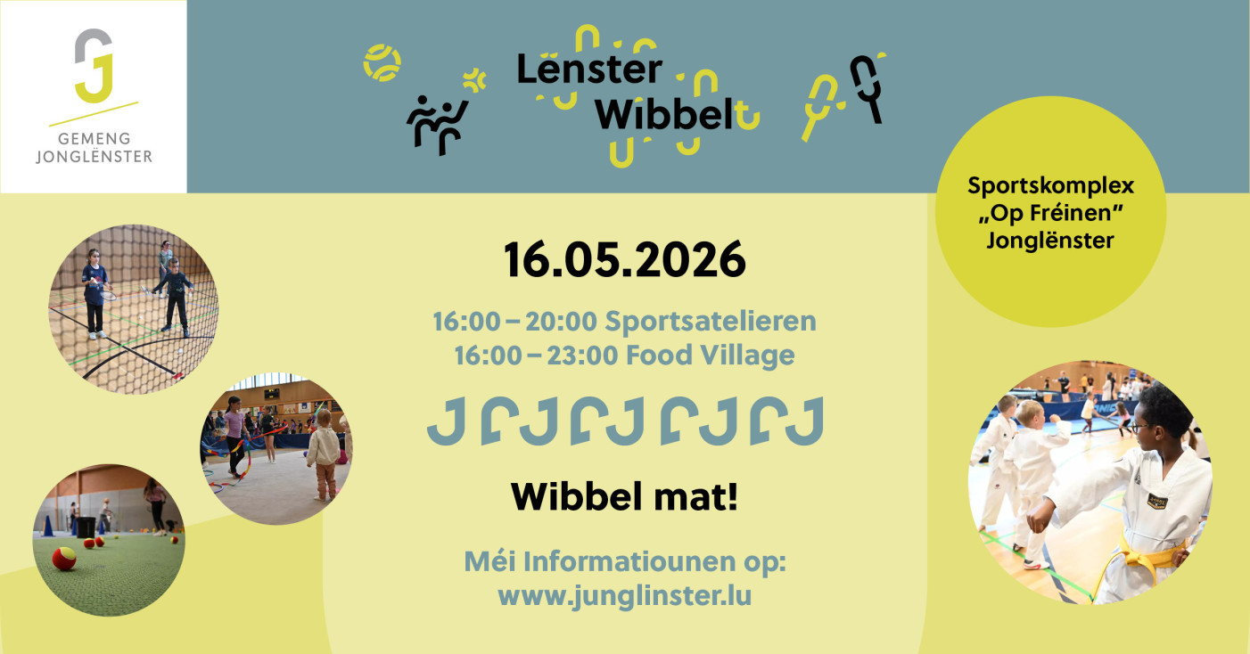 Kommt den 16. Mee 2026 bei de Centre Sportif "op Fréinen" zu Jonglënster an entdeckt all déi flott Atelieren a Sportaarten, déi d'Veräiner an eiser Gemeng ubidden, a villes méi! Fir Iessen a Gedrénks ass an eisem Food Village natierlech och gesuergt.