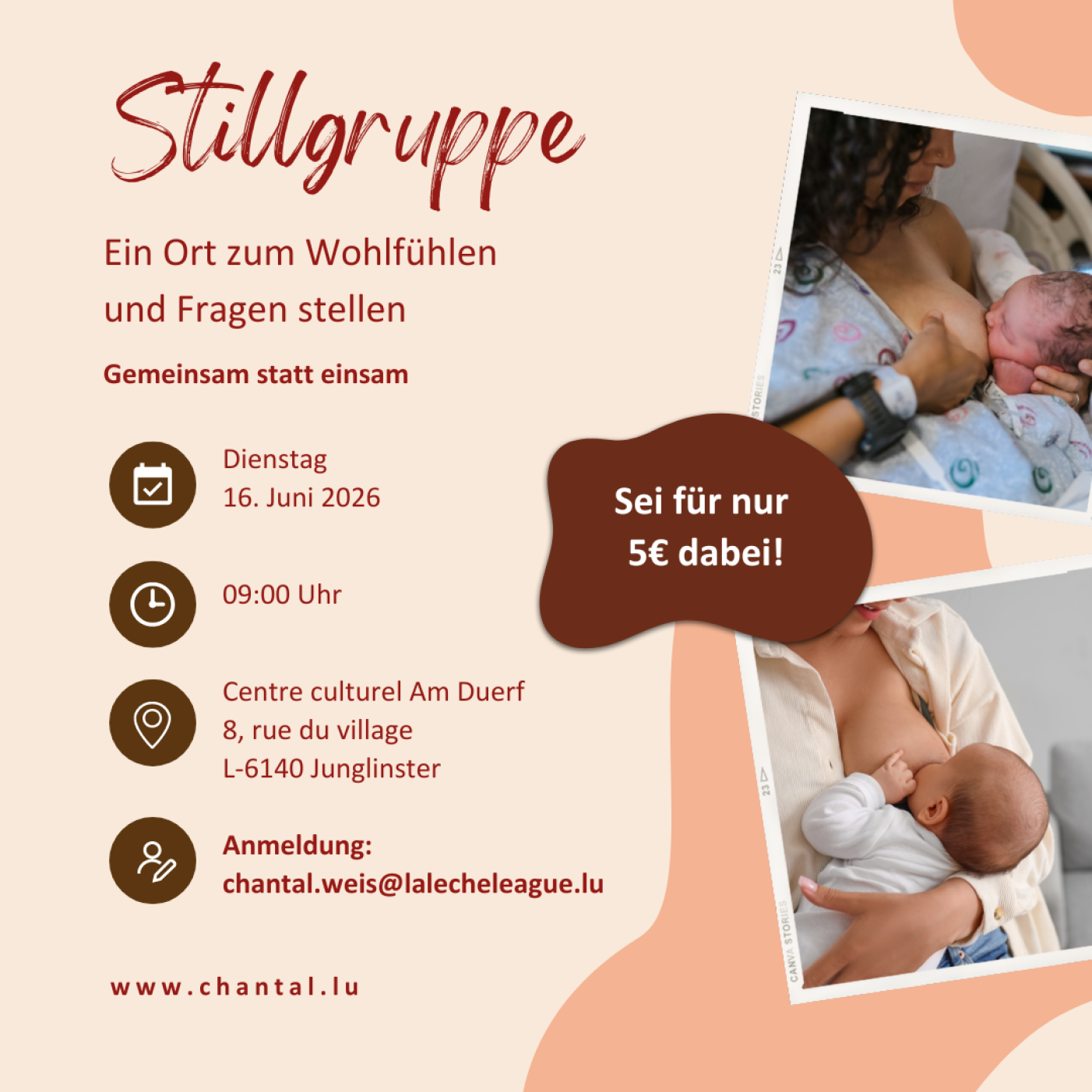 Kosten: Für Mitglieder der La Leche League Luxemburg gratis, Nicht-Mitglieder 5 €